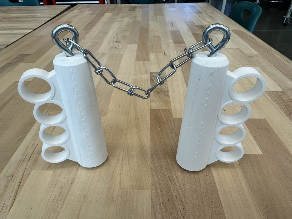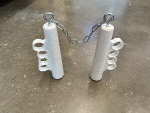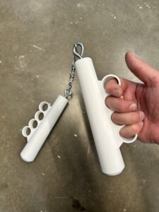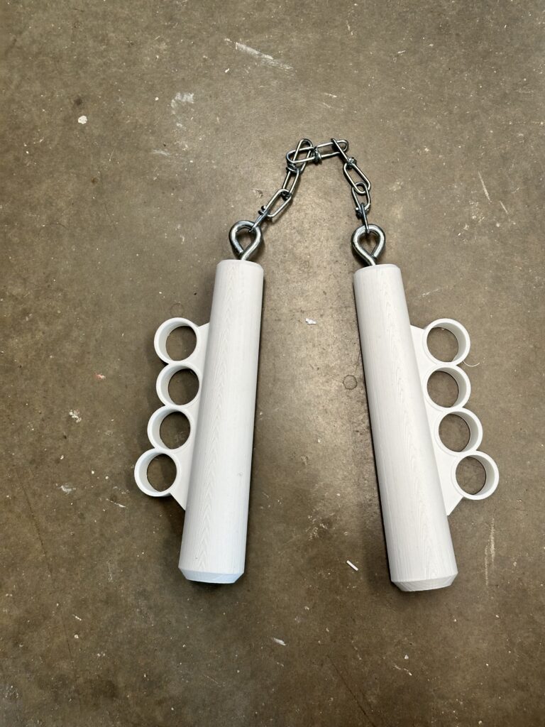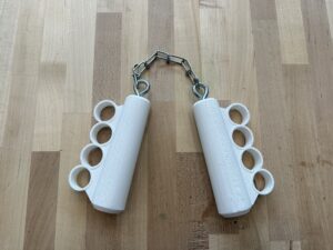 NunKnucks (2026) is a mash up of two childhood icons, brass knuckles and nunchucks or nunchaku, that enters the realm of the absurd in that the nunchucks are made unusable by the addition of the brass knuckles, and the chain only further shackles the hands of the person wearing them. Two versions are listed below, short: NunKnucks v.1 (2026) and long: NunKnucks v.2 (2026).