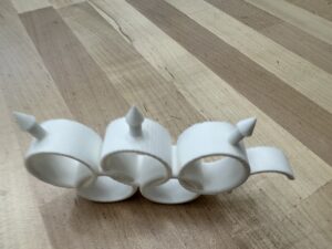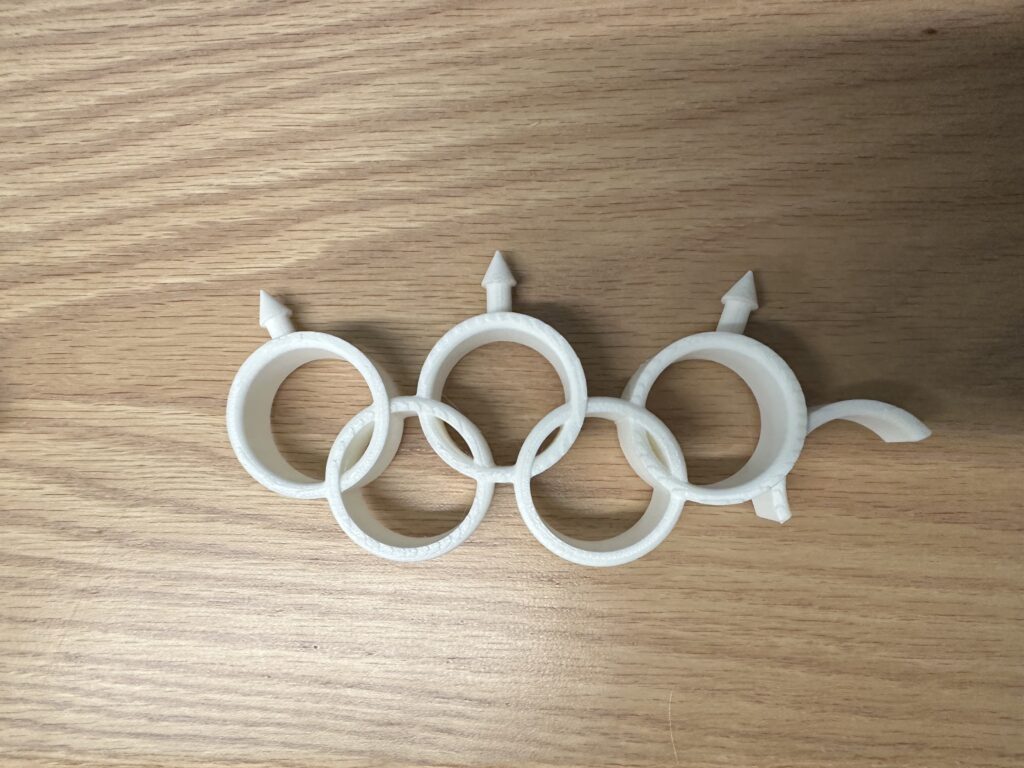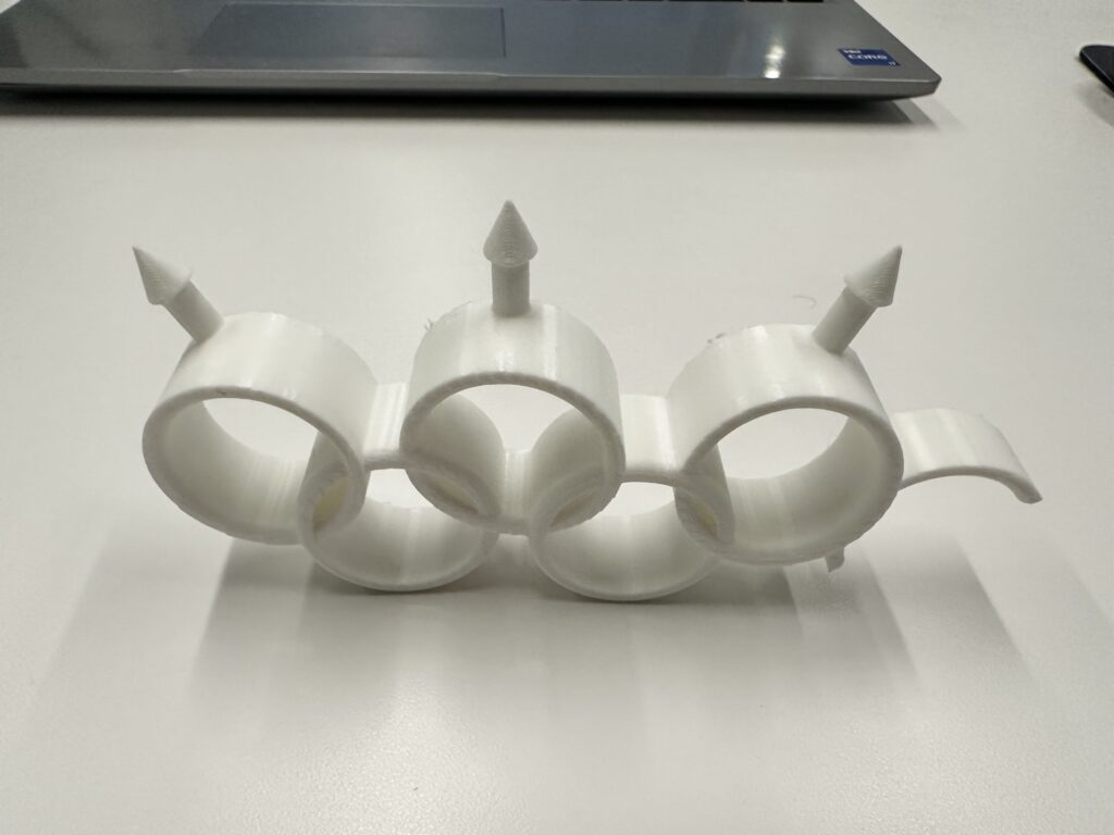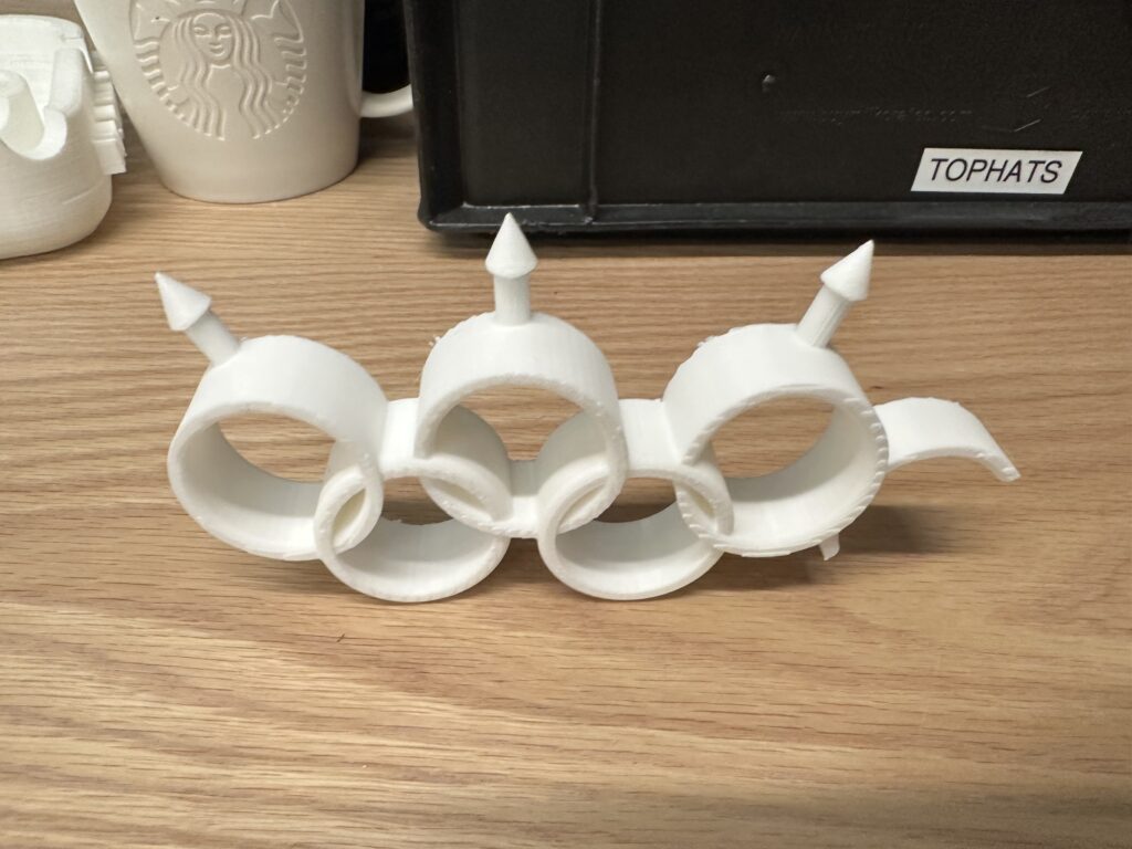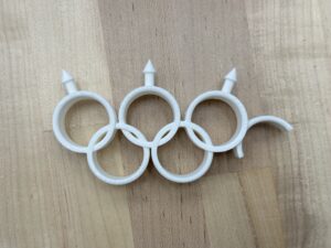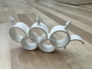 Olympian Spikes (2026) is a playfully absurd object wearable that merges the familiar Olympic symbol with spiked brass knuckles.